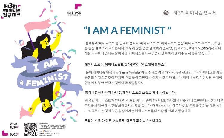 <제 3회 페미니즘 연극제> 주제: I AM A FEMINIST 기간: 2020년 6월 26일(금) - 2020년 8월 2일(일) 장소: 1M SPACE 주최: 페미씨어터 주관: 수수파보리, 상상공터, 엘리펀트룸, 바람컴퍼니, 윤상은, 이산, 메두사, 사거리가 되어라 협력: 신촌문화발전소, 퍼플레이, 플레이포라이프 후원: 한국여성재단 문의: 010-2069-7202 https://sites.google.com/view/femitheatre