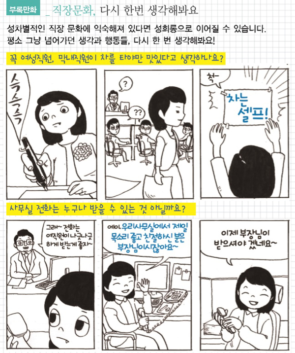 ※ 성폭력 피해자가 혼자 견뎌야 하는 시간을 함께하고자 만든 소책자 <순간>과, 직장의 모든 구성원이 직장 내 성희롱 사건 해결 과정에 함께하는 법을 안내하는 소책자 <평범한 용기>를 나눠드립니다. 문의: 한국여성민우회 여성노동팀 02-737-5763, equallove@womenlink.or.kr
