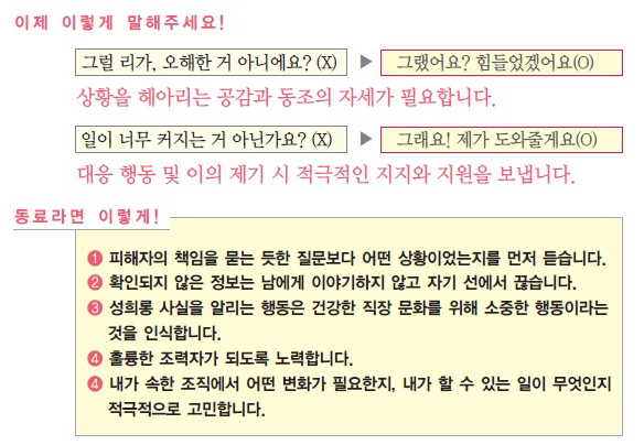 직장 내 성희롱 피해자들은 왜 참지 않고 문제를 제기했느냐는 물음에 “또 다른 피해자가 나오는 것을 막기 위해서” 피해 사실을 신고했다고 대답하는 경우가 많다. 부당한 일을 문제 제기하는 성희롱 피해자는 용기 있게 먼저 나서서 조직의 잘못된 문화를 바꿔나가는 사람이다. 피해자와 함께 동료들이 주체가 되어 사건의 올바른 해결을 위해 노력하는 과정은 피해자의 회복뿐만 아니라 성희롱 사건의 재발을 막고, 공동체의 변화를 만드는 시작점이 된다.