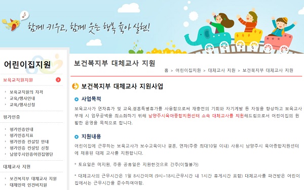 4개월간 지원사업 중단을 통보한 남양주시 육아종합지원센터는 1월부터 4월까지 대체교사 신청 수요가 적기 때문이라는 이유를 댔다.