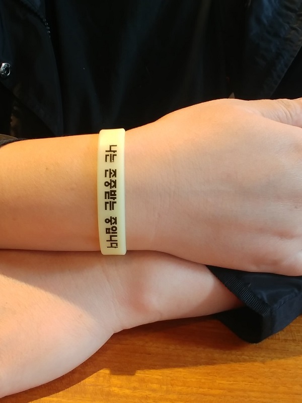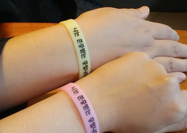 그녀가 손목에 낀 야광 팔찌에 새겨진 문구에 눈이 간다.
