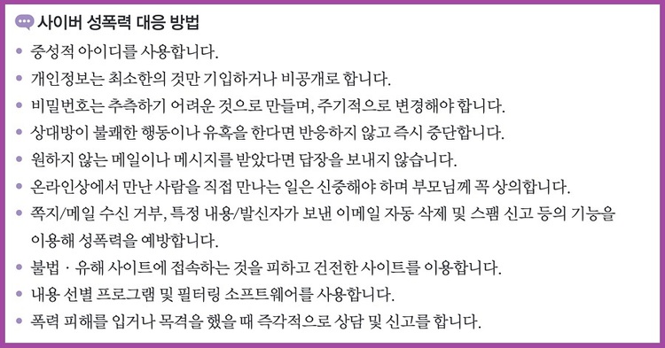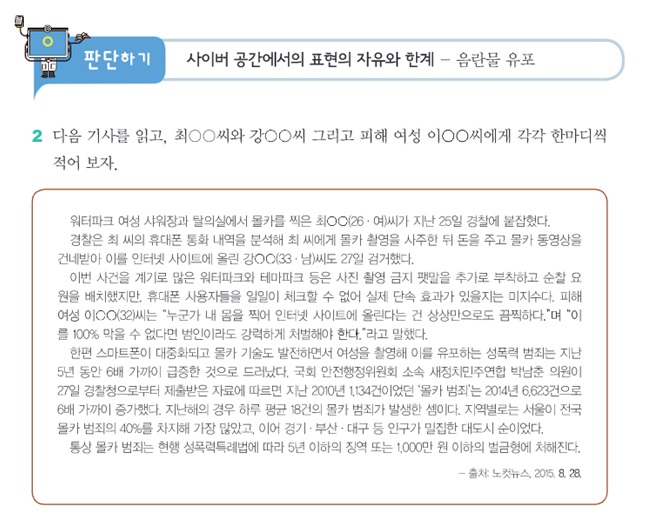 이 부분도 기존의 제도화된 폭력예방교육의 양식에 의존하고 있고, 이마저도 내용상 부적절한 부분이 많고 전문성이 결여돼 매우 우려스럽다. 예를 들어 워터파크 샤워장에 디지털 카메라를 설치한 사례와 같이 명백한 성폭력을 두고 ‘음란물 유포’나 ‘표현의 자유와 한계’라는 주제로 다루는 것이 대표적이다.