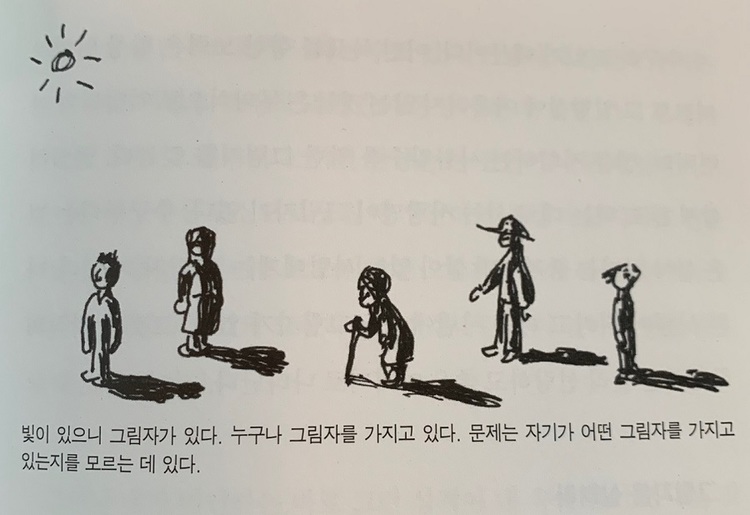 “우리는 모두 그림자를 지니고 있다. 우리 모두 어떤 사람이 되고자 추구하고 있기 때문이다. 어떤 목표를 향한 노력은 ‘일방’이므로 그 일방성에 어울리지 않는 것은 무의식적으로 억압되기 마련이다. (...) 추구한다는 것은 살아있다는 증거이며 살아있는 사람에게는 ‘그림자’가 있다.” (이부영, 『분석심리학 이야기』)