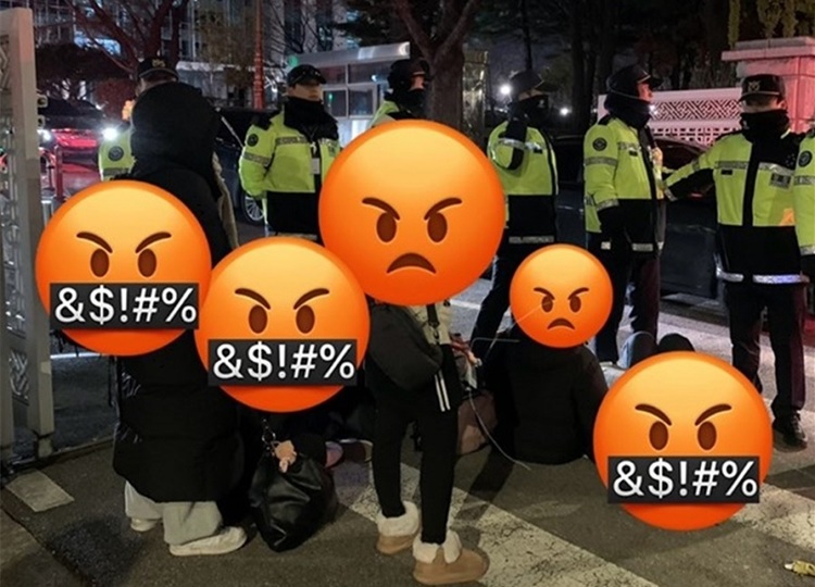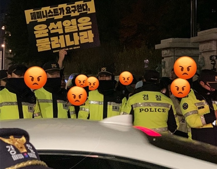 하지만 12월 7일 자정 무렵, 그 차가운 아스팔트에 깔개조차 깔 시간도 없이 눕고 앉아 있던 여성들은 남성 경찰들의 경고, 조언(?)에도 그 자리를 굳건하게 지켰다. 시민들이 이 모습을 보고 조금씩 모여들었고, 15명도 안 되던 사람들은 어느새 1백명 정도의 군중이 되어 “윤석열 탄핵!”을 외쳤다.