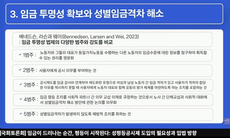 구직자의 임금정보 청구권, 종사자의 임금정보 청구권도 포함되었다. 김 변호사는 “만약 사업주가 임금정보 제공을 거부할 경우, 법적으로 동일가치 노동에 대한 동일임금이 지급되지 않은 것으로 ‘추정’하는 강력한 조항을 두어 성실한 이행을 강제해야 한다.”고 덧붙였다.