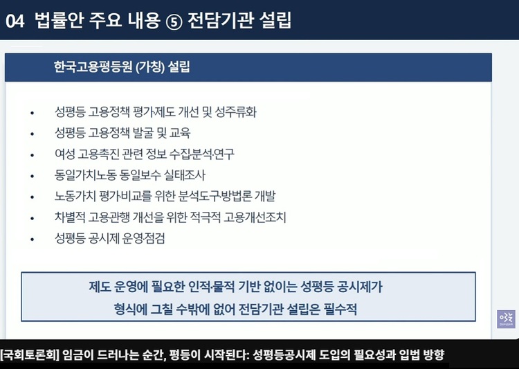 김두나 변호사는 ‘성평등 공시에 관한 법률’(가칭)을 입법할 것을 제안했다. 이 법안은 여성노동연대회의와 민변 여성인권위원회가 함께 논의하여 만든 것이다.