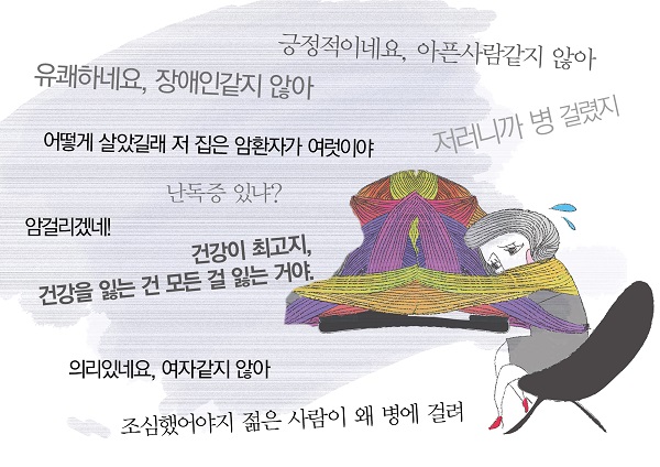 누구에게나 질병을 겪는 건 어려운 일이다. 생명체로서 질병에 대한 생래적 두려움도 있지만, 질병에 대한 사회 안전망이 절대적으로 부족한 현실은 불안을 크게 가중시켰다. 결국 박탈감 가득한 광폭한 신자유주의 사회에서 질병은 내 삶의 안전을 위협하는, 외면하고 싶은 위험 중 하나일 뿐이다. 그리고 어떤 이들은 아픈 몸이나 질병을 희화화함으로써 질병에 대한 깊은 불안을 잠시라도 해소하고 싶어 하는 것 같다.
