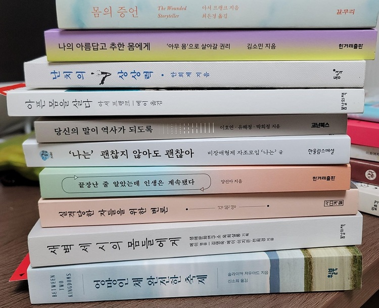 “아프게 되면서, 책을 여러 권 읽었거든요. 그중에 『난치의 상상력』이 제일 좋았어요. 크론병으로 투병중인 20대가 우리 사회에서 아픈 청춘으로 살아가는 것이 얼마나 힘든지, 우리 사회에 어떤 상상력이 필요한지 이야기하는 책인데, 계속 밑줄 치면서 읽었어요. 제가 하고 싶은 이야기를 다 해놓았더라구요. 그런 순간 있잖아요. 내가 생각하지 못한 문제 의식을 다른 사람이 집어냈을 때, 머리를 한 대 맞은 것 같은. 저한테 ‘왜 청춘은 건강한 젊은 남성의 얼굴을 하고 있는가’라는 책 속의 질문이 그랬어요. 왜 아프기 전에는 단 한 번도 그런 생각을 안 해봤는지 모르겠어요.”